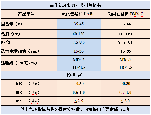 Alumina and boehmite slurry was developed to meet the special requirements of ceramic separator for lithium-ion battery. The film has the characteristics of stable thermal shrinkage, good air permeability, smooth membrane surface, high peel strength and low water content.