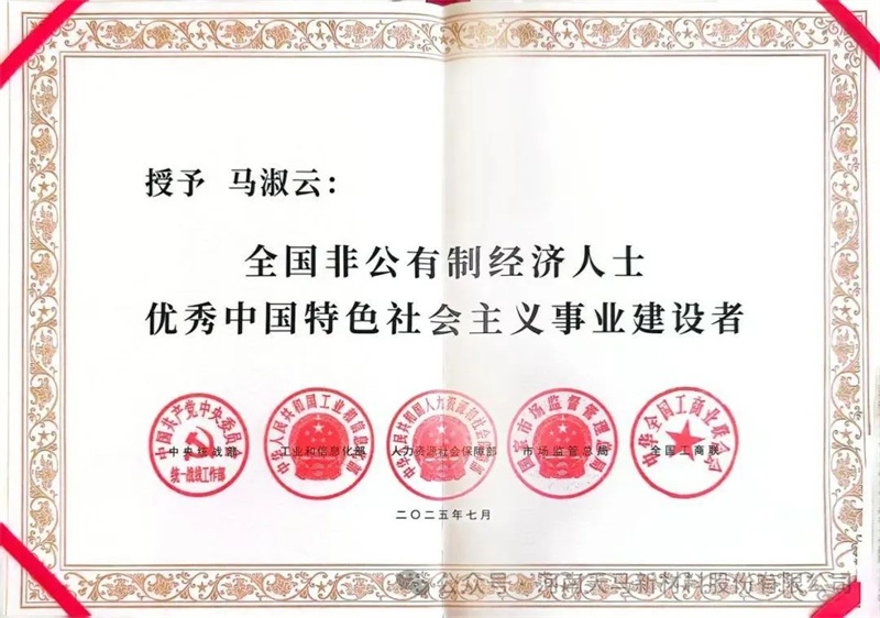 On July 29, 2025, the 6th commendation conference for "non-public economic personages and builders of socialism with Chinese characteristics" jointly held by the United Front Work Department of the CPC Central Committee, the Ministry of Industry and Information Technology, the Ministry of Human Resources and Social Security, the State Administration for Market Regulation, and the All-China Federation of Industry and Commerce was held in Beijing. The conference commended a total of 100 outstanding representatives of the private economy and awarded them the title of "non-public economic personages and builders of socialism with Chinese characteristics". Ma Shuyun, chairman of Henan Tianma New Material Co., Ltd., was successfully selected.